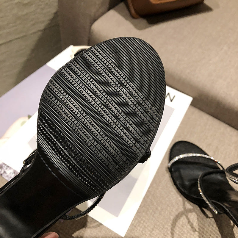 These sandals feature a Roman-style design with a fish mouth toe shape, adding a touch of sophistication and allure to your look. The popular elements of rhinestones and buckles enhance the overall aesthetic appeal, making these sandals a true fashion statement.