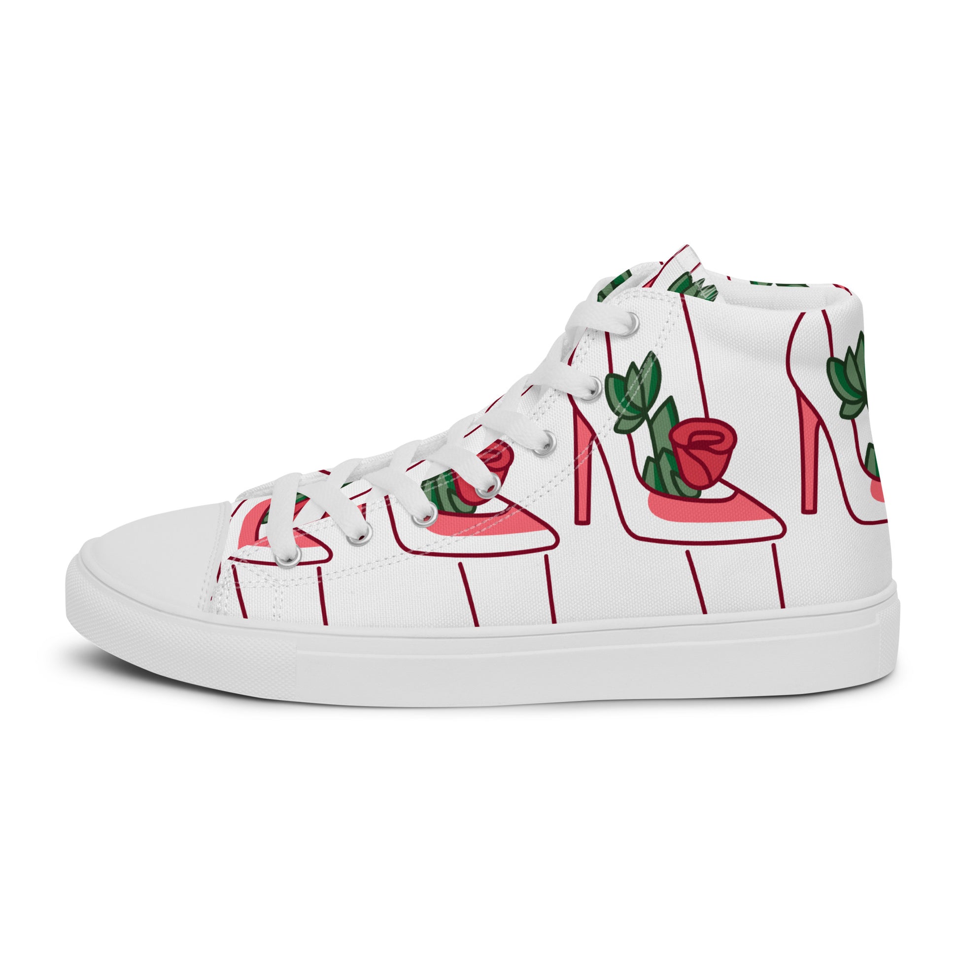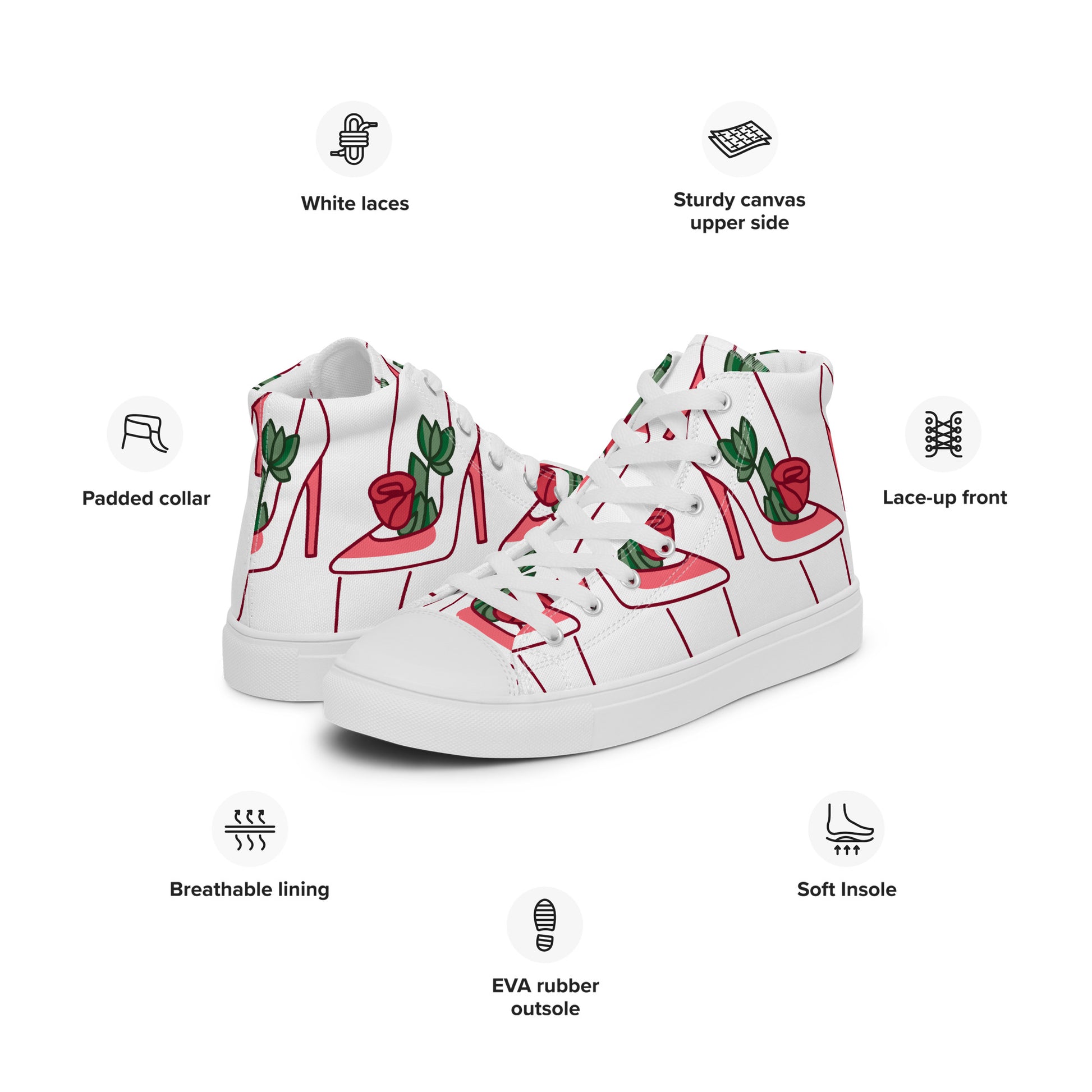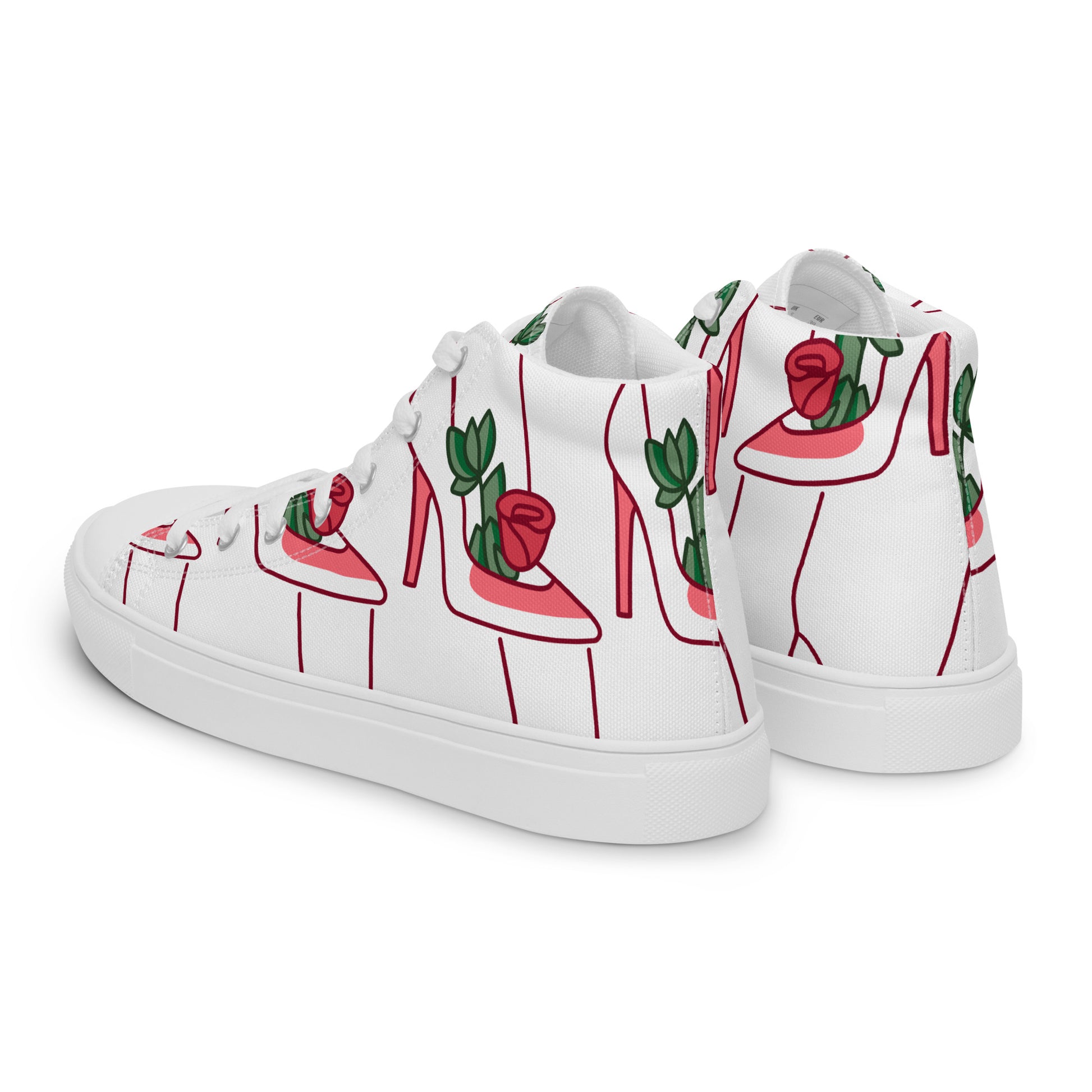 These sneakers feature an abstract rose shoe pattern, combining the elements of a high heel pump and a high top sneaker. This fusion of styles creates an intriguing and playful design.